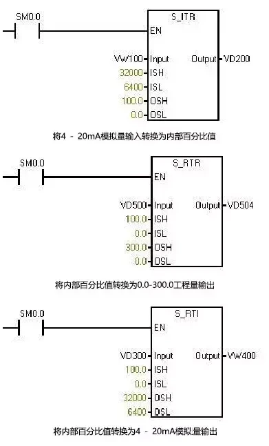 注意(yì):此指令(lìng)庫/程(chéng)序的(de)作者和(hé)擁有(yǒu)者對(duì)於該軟件(jiàn)的(de)功能性和兼容性不負任何責任。使用該軟件的(de)風險完全由用戶自行承擔。由於它是免費的,所以不(bú)提供任何擔保,錯誤糾正(zhèng)和(hé)熱線支持,用戶不必為此聯係西門子技(jì)術支持與服務部門。 在這個指令庫中,子程序Scale_I_to_R可用來(lái)進行模擬量輸(shū)入到S7-200內部數據的(de)轉換;子程(chéng)序Scale_R_I可用於內部數據到(dào)模擬量輸出(chū)的轉換。