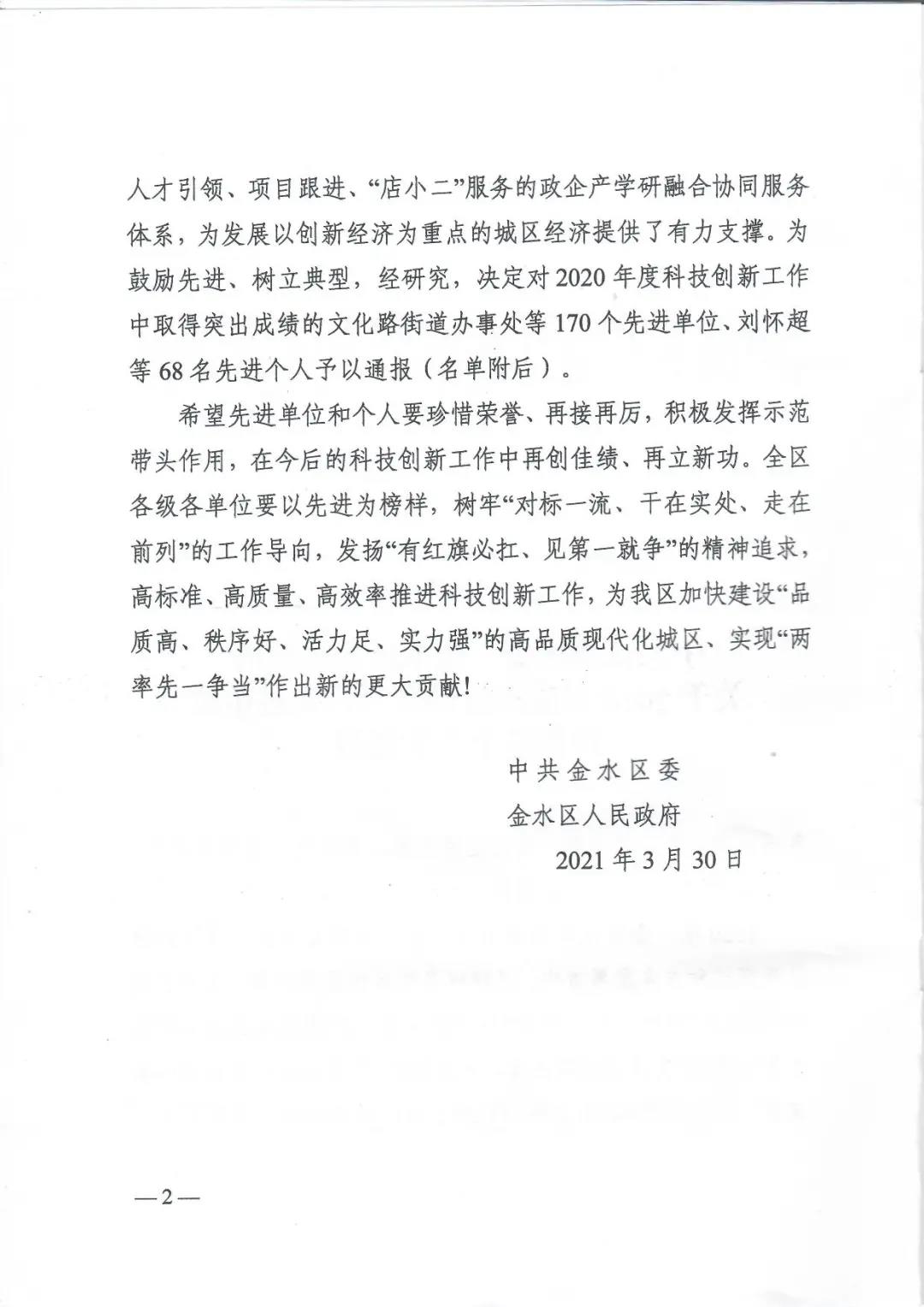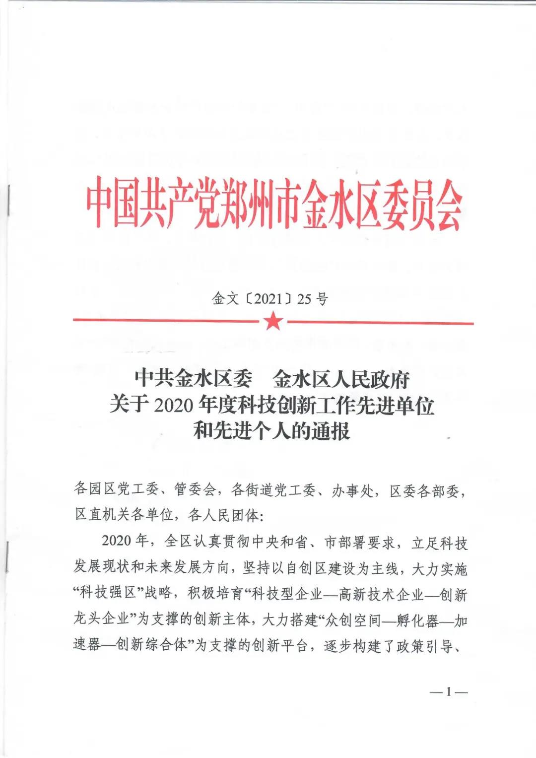 2021年3月30日,中共金水區委 金水區人民政府印發(fā)了“關於2020年(nián)度科技創新工作先進單位和先(xiān)進個人的通報”,河南省天天综合7799自動化係統有限公司榮(róng)獲2020年度科技創新工(gōng)作先進單位稱號。
