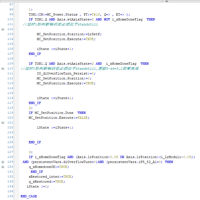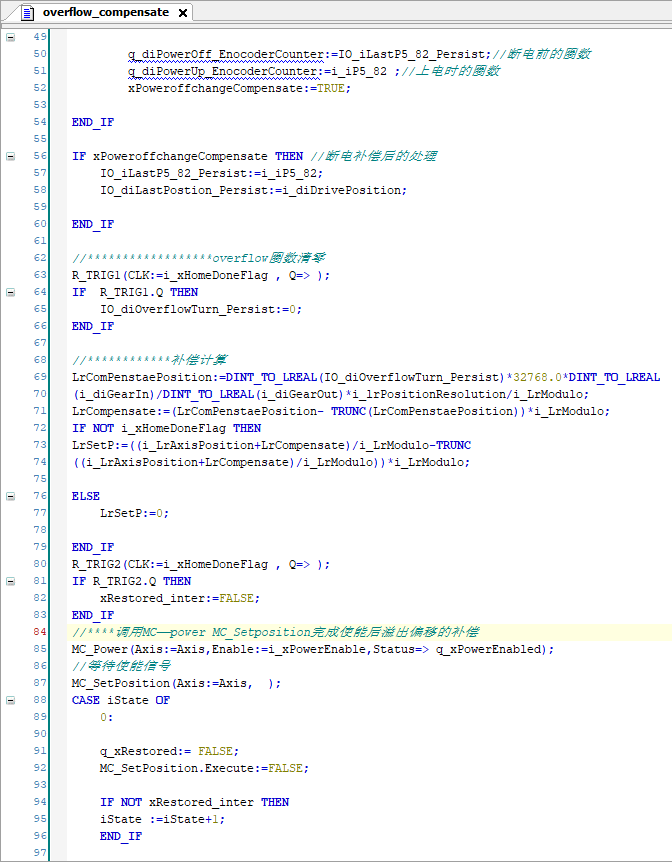 雙(shuāng)擊打開【overflow_compensate】的FB功能塊編寫程序,功能(néng)塊的編程(chéng)思路就(jiù)是程序不僅記錄(lù)正常運行的每次溢出,再利用一(yī)個掉電保存的persistent變量記錄位(wèi)置溢出的次數,在上(shàng)電時判斷斷電後電機是否發生移動並導(dǎo)致了新的溢出,將兩者的變化量加到一起得到總的(de)溢出次數,並按總的溢(yì)出次數做對應補償,然後給伺服軸加上使能後(hòu),判斷軸處於停止位(wèi)置後(hòu)再使用MC_Setpostion功能塊完成位置(zhì)補(bǔ)償。LXM28S多圈位置溢出功能塊的ST程序和注釋如圖6所示。