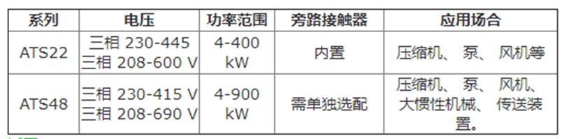 ATS22軟起動器內置了旁(páng)路接觸(chù)器,不能外(wài)加(jiā)旁路接觸器;ATS48軟(ruǎn)起動器是(shì)外置旁路接觸器(qì),需要(yào)外置旁路接觸器可以單(dān)獨配。旁路接觸器的作用是當軟起動器啟動完成後,切換到旁路,電流會從旁路接(jiē)觸器流入流出,軟起動器可控矽幾乎無電流流入流出,從而增加軟起動器的壽命,ATS48軟起動器不是(shì)必選旁路接觸器,為了增加軟起動器使用壽(shòu)命我們強烈建議加旁路接(jiē)觸器。